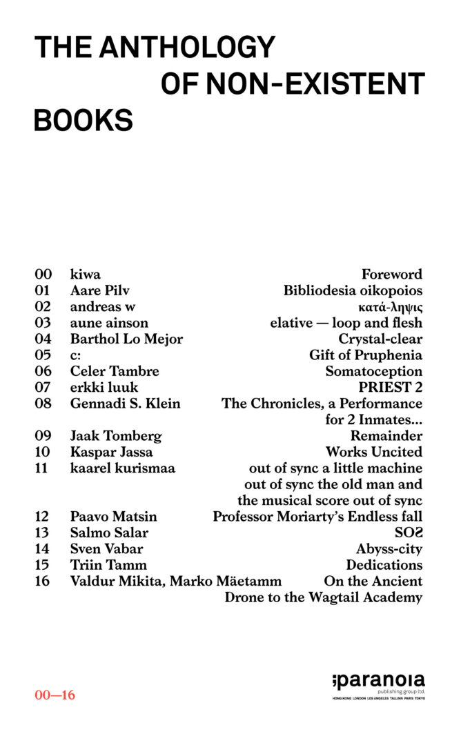 the compiler of the book, Kiwa, resumes in his foreword the earlier existing history of non-existent books and Aare Pilv directs his attention to the house-manuscript of Wittgenstein. Valdur Mikita performs the flight-expeditions on the ancient drones, accompanied by Marko Mäetamm. Triin Tamm potters with the language of dedications without books and andreas w investigates what would come if we would leave everything unwritten. Sven Vabar and c: undertake psychogeographical expeditions to investigate the ways of being of prufenics and the hierarchies of vertical apparitions. the mapper of periferies and tention-zones, Aune Ainson, focuses her magnifying class on flesh and Barthol Lo Mejor shows how slang turns the book into non-existent one. Kaarel Kurismaa searches for the soul-life of miniature machines, Kaspar Jassa leafs through unused literature, Jaak Tomberg postulates a person who misses a book and the icon of estonian progressive literature. the phd. in neurolinguistics, Erkki Luuk finally relieves what is uhvutiv klõps (vanishing click during taking a picture). the debutants released in the anthology are Celer Tambre, Salmo Salar and Gennadi S. Klein. Tambre views the non-existant body-imaginations and Salmo Salar notifies that everyday drama shouldn’t lack palindromes. Gennadi S. Klein shifts the basic parameters of psychosis